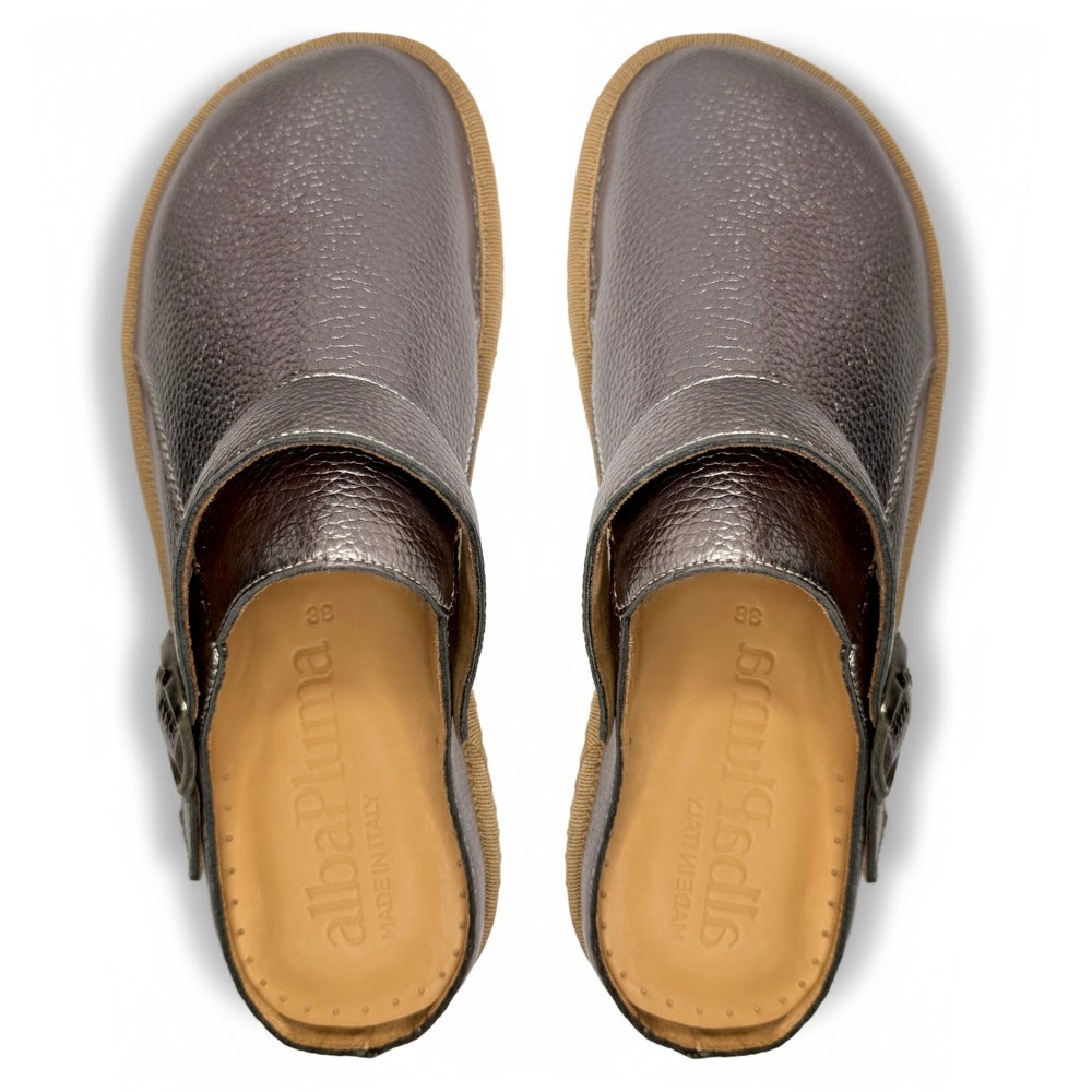 I sabot albaPluma sono realizzati in bottega calzaturiera a Gonars (in provincia di Udine) con la lavorazione bordata nell’orlatura, una tecnica di finitura che prevede la rifinitura dei bordi per evitare sfilacciamenti, conferendo così un aspetto ordinato e resistente.